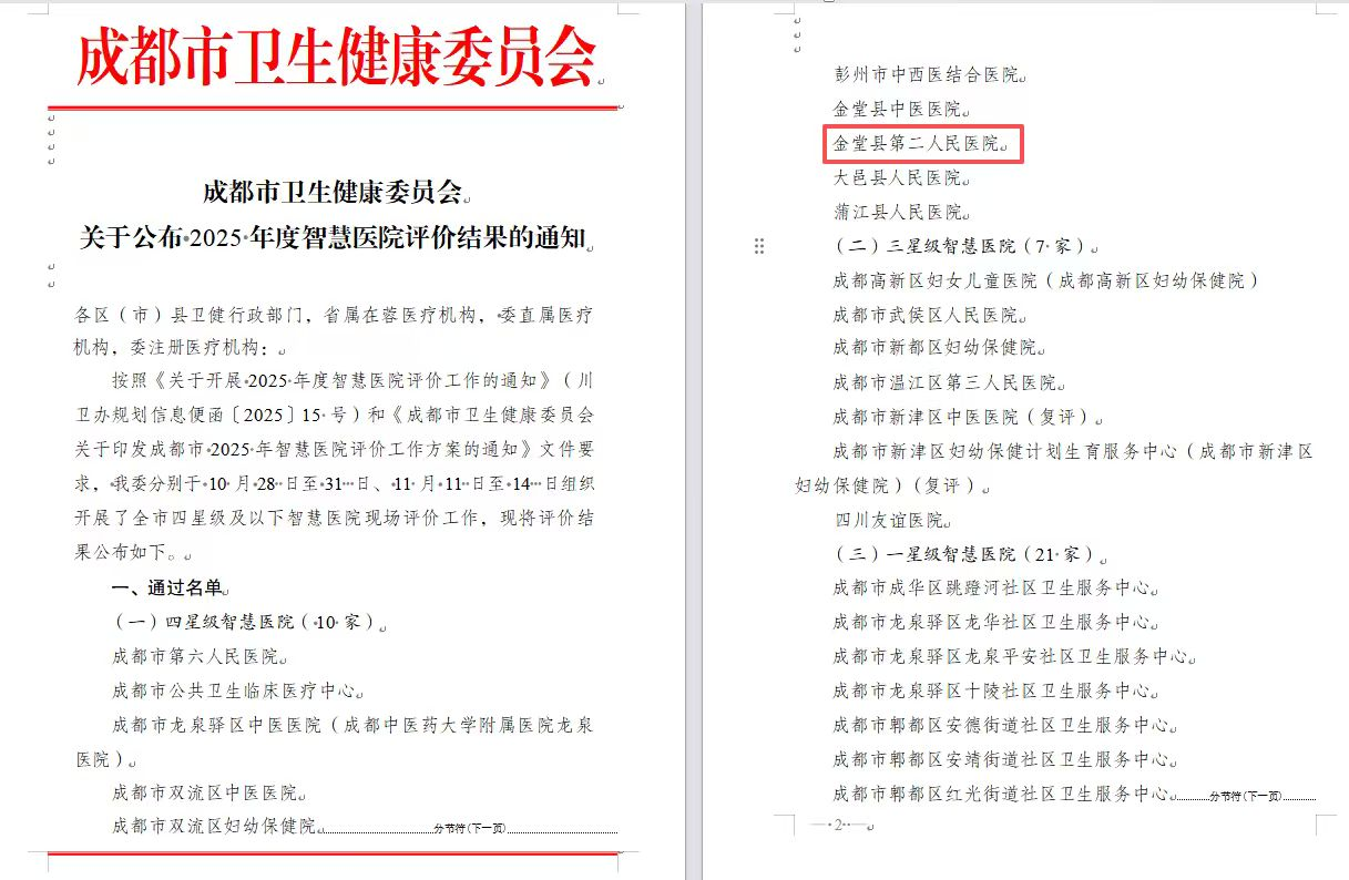 1月6日,成都市卫生健康委员会正式印发《关于公布2025年度智慧医院评价结果的通知》,我院顺利通过评审,成功获评四星级智慧医院!